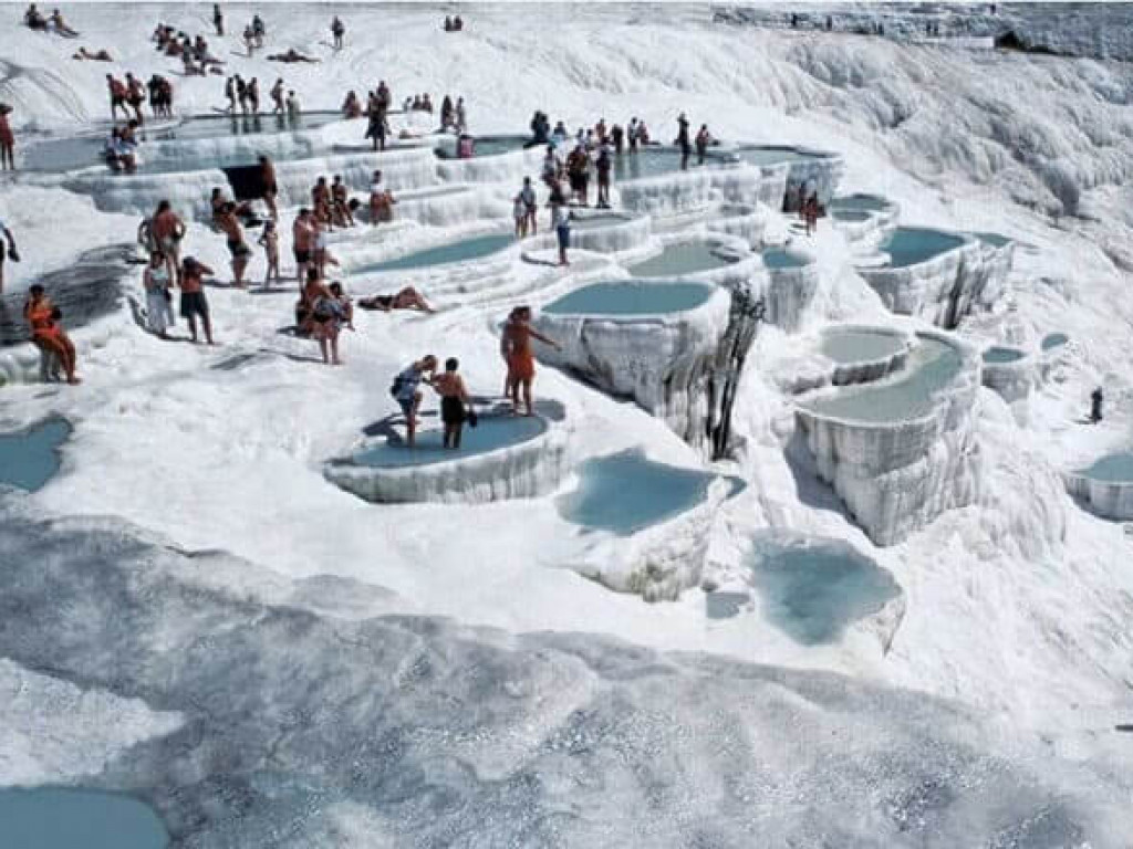 Istanbul, kota terbesar di Turki, memiliki landmark ikonik seperti Hagia Sophia, Blue Mosque, dan Grand Bazaar. Cappadocia menawarkan pemandangan balon udara di atas lembah bebatuan unik. Di Pamukkale, wisatawan dapat menikmati kolam air panas alami yang terbentuk dari endapan mineral. Selain itu, Turki juga memiliki pantai indah di Antalya dan sejarah kuno di Efesus yang menarik bagi pecinta arkeologi.